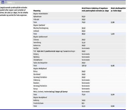 I Tabel 1 er det opgjort, hvor mange akutlægebilstimer, der i de forskellige regioner ydes pr. døgn. Dette er i Figur 1 holdt op mod henholdsvis areal og befolkningstal [5].