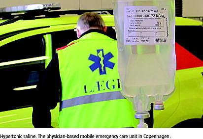 En metaanalyse har vist en signifikant bedre overlevelse blandt patienter med svære hovedtraumer og hypotension ved behandling med hypertont NaCl (HN) versus isotone væsker. I 2008 kom der skandinaviske kliniske retningslinjer på området, som er baseret på Brain Trauma Foundations kliniske retningslinjer. Ifølge retningslinjerne anbefales HN til patienter med svære hovedtraumer og hypotension. Der er dog ikke entydig evidens for denne anbefaling. Akutlægebilen i København (ALB), som er bemandet med speciallæger i anæstesiologi, indførte i 2006 HN til patienter med svære hovedtraumer og hypotension. Siden er det imidlertid kun anvendt sparsomt: I perioden fra 1. september 2006 til 30. juni 2010 havde ALB 39.936 patientkontakter, hvoraf 54 umiddelbart opfyldte kriterierne for HN. Ud af de 54 patienter fik syv NH.