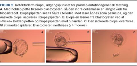 Kvinden gennemgår hormonstimulation, og efter ægudtagning injiceres én sædcelle i hvert æg (ICSI). Befrugtede æg dyrkes i laboratoriet i 5-6 dage indtil blastocyststadiet (ca. 150 celler), hvor der biopteres 5-10 celler fra den tidlige moderkage, trofektodermen (trofoektoderm (TE)-biopsi) (Figur 2). Herefter nedfryses blastocysten, og biopsien testes for den kendte genetiske variant. Når svaret på den genetiske analyse foreligger, kan blastocyster uden den kendte genetiske afvigelse lægges tilbage i livmoderen.