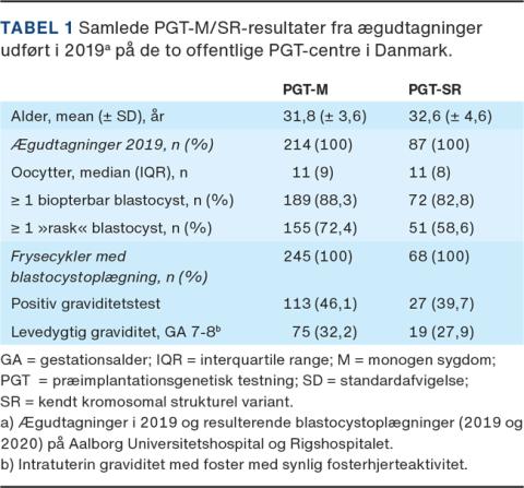 Den største fællesberetning af data foretages af PGT-konsortiet under Det Europæiske Selskab for Reproduktion og Embryologi. I den seneste beretning for perioden 2013-2015 sås en stigning i antal behandlinger (> 11.000 ægudtagninger i 2015, hvoraf PGT-A udgjorde hovedparten) samt et skift fra biopsi på ottecellestadiet til TE-biopsi på blastocyster [17]. Den kliniske graviditetsrate var 30-40% pr. embryooplægning og 20-25% pr. ægudtagning. De samlede PGT-M/SR-resultater fra ægudtagninger udført i 2019 på de to offentlige PGT-centre i Danmark kan ses i Tabel 1.Der er fin overensstemmelse med de europæiske resultater [17], ikke mindst i betragtning af at vi i Danmark kun lægger én blastocyst tilbage ad gangen for at undgå flerfoldsgraviditet.