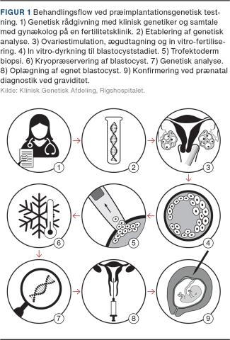 Ved præimplantationsgenetisk testning (PGT), også kaldet ægsortering, kombinerer man genetisk testning med assisteret reproduktionsteknologi. PGT muliggør testning af embryoner forud for etablering af graviditet og er en behandling, der kan tilbydes familier med kendt risiko for at få et barn med en alvorlig arvelig sygdom. Der skelnes imellem test for monogen sygdom (PGT-M) og kendt kromosomal strukturel variant (PGT-SR) samt screening for aneuploidi (PGT-A) [1]. Behandlingsflowet er skitseret i Figur 1.