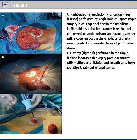 Med forbehold for den lille selekterede studiepopulation, er SILS-proceduren en sikker og skånsom metode til anlæggelse af stomi som aflastende procedure for colon- og rectumlidelser og efterlader ikke andet ar end stomien. For mindre coloncancere er SILS ligeværdigt med CLS i vort regi, om end ekstra hjælpeporte var nødvendige i læringsfasen. Man må afvente nye større blindede randomiserede undersøgelser til afklaring af, om SILS kan mindske behovet for morfin i den postoperative periode.