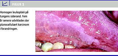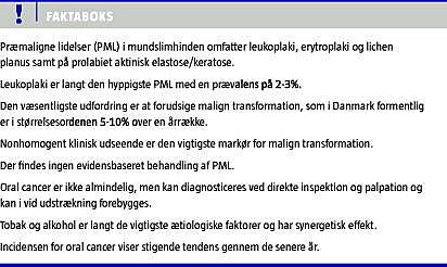 Summary Premalignant disorders and cancer of the oral mucosa Ugeskr Læger 2010;172(44):3040-3042 Premalignant disorders of the oral mucosa primarily includes oral leukoplakia. The critical problem is to predict future malignant development. Several markers of malignant development have been suggested, however, possibly the most important is a non-homogeneous clinical appearance. There is no evidence that surgical intervention reduces the risk of malignant transformation. Oral cancer is relatively rare, however, easily detectable and preventable; tobacco and alcohol are by far the most important aetiologic factors. Increasing trends in rates of intraoral cancer are seen in many countries.