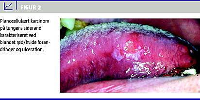 Tunge, mundbund, kindslimhinde og processus alveolaris i underkæben er de hyppigst afficerede regioner [16]. Symptomerne er meget varierende for mundhuletumorerne; fra ingen over let svien/ømhed til egentlig smerte. En følelse af hævelse i munden, problemer med en protese eller hævede lymfeknuder på halsen er ikke sjælden. Større orale cancere manifesterer sig oftest som sår med hævede, voldformede rande eller som uregelmæssigt knoldede blandet rød/hvide forandringer med tydelig induration og vil normalt ikke udgøre en diagnostisk udfordring. Det kliniske problem udgøres af de mindre cancere, der kan ligne traumatisk inducerede forandringer, som ikke er sjældne i mundhulen. Sår, der ikke heler efter elimination af mulige traumatiske årsager (skarpe fyldningskanter, proteser mv.), bør altid vække mistanke, ligesom nok så små blandet rød/hvide forandringer og nodulære dannelser i slimhinden er suspekte (Figur 2 ). Der er ikke substantiel evidens for at hjælpemidler til klinisk diagnostik af oral cancer, f.eks. indfarvning med toluidinblå og børstebiopsi, forbedrer diagnostikken i forhold til inspektion og palpation, og biopsi er under alle omstændigheder nødvendig [19]. Effekten af screeningsprogrammer er forsøgt belyst i mange studier, men i et nyligt publiceret Cochrane-review [20] konkluderes det, at der ikke er tilstrækkelig evidens for at initiere screeningsprogrammer for oral cancer på samfundsniveau. Givet kendskabet til væsentlige årsagsfaktorer må en styrket forebyggelsesindsats formodes at have større effekt, herunder i form af øget fokus på problemet ved tandlæge- og lægebesøg samt en øget indsats i kendte risikopopulationer.