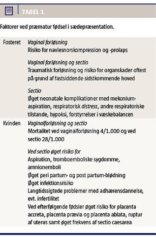 Ved præmatur fødsel med foster i UK vil der være individuelle hensyn at tage til mor og foster (Tabel 1). Der skal informeres om relationen mellem gesta-tionsalder og barnets prognose med hensyn til mortalitet og morbiditet samt både kortvarende og blivende handikap. Dette sker oftest i samarbejde med en neonatalog. Kontraindikationer for vaginalforløsning må udelukkes. Det drejer sig om f.eks. navlesnorsfremfald, disproportio foetopelvina og fostermisdannelser, som gør vaginalforløsning vanskelig eller umulig. Herefter burde en vaginal fødsel præmaturt med foster i UK kunne overvejes som værende et fornuftigt og forsvarligt valg [1-5].