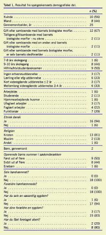 I Tabel 1 gengives resultaterne fra de demografiske spørgsmål. Flere kvinder, end mænd indsendte svar. Blandt mændene svarede to ikkebiologiske fædre. To tredjedele af de adspurgte var gift eller samboende med barnets anden biologiske forælder, mens den resterende tredjedel enten levede alene eller med en anden end den biologiske forælder. Ingen af forældrene var hørehæmmede eller havde selv hørehæmmede forældre.