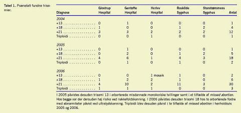 Introduktion: Efter Sundhedstyrelsens nye retningslinjer for fosterdiagnostik i 2004 er der indført et tilbud til alle gravide om risikovurdering for Downs syndrom. Vi har opgjort præ- og postnatalt fundne kromosomafvigelser i tre amter i 2004, 2005 og 2006.