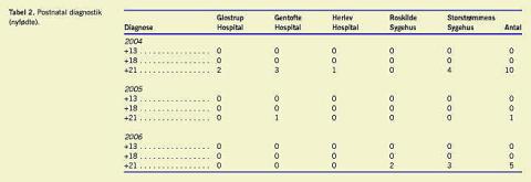I 2006 fandtes trisomi 21 hos 30 fostre, heraf en med mosaiktilstand i placenta (confined placenta mosaicism) . I 25 tilfælde var indikationen for invasiv prøve forhøjet risiko, i fem tilfælde var der anden indikation: ætas, anxietas og abnormt fund ved ultralydskanning. Alle 29 fostre med ren (non-mosaik) trisomi blev aborteret, og for 27 blev der foretaget opfølgende undersøgelse af fostret. Hos alle undersøgte blev trisomidiagnosen bekræftet. Et foster havde trisomi på baggrund af en de novo-opstået ubalanceret translokation.