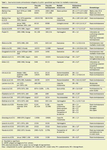 Vi fandt fire case-kontrol-studier [4, 15, 20, 21], og i alle fire blev der påvist en forøget risiko for uspecificerede medfødte misdannelser, heraf nåede man i et studie statistisk signifikans. Ud af syv kohortestudier [29-35] påviste man i fire en forøget risiko. Sammenfattende pegede resultaterne af case-kontrol-studierne på, at prænatal udsættelse for p-piller kunne være korreleret med en øget risiko for uspecificerede misdannelser i størrelsesordenen 1,3-2. Kohortestudierne gav ikke entydige resultater.