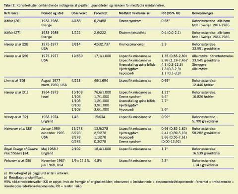 Ud af fem case-kontrol-studier [7, 19, 20, 22, 24] påviste man i fire en forøget risiko for medfødte hjertefejl. Ud af tre kohortestudier [29, 31, 33] påviste man i to en forøget risiko. Case-kontrol-studiet, hvori der ikke blev påvist en forøget risiko, var Pradats svenske studie, hvor information om brug af p-piller var indsamlet prospektivt [7]. Sammenfattende pegede resultaterne af både case-kontrol-studierne og kohortestudierne på, at prænatal udsættelse for p-piller kunne være korreleret med en øget risiko for medfødte hjertefejl i størrelsesordenen 1,5-2.