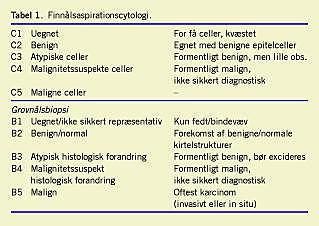 Det er en forudsætning, at såvel punktør som patolog har erfaring med metoden, og dens grad af anvendelse varierer i Europa [3, 4]. Risiko for egentlig fejlfortolkning foreligger ved hypocellulære og stromale forandringer. Nekrose og mikroforkalkninger er problematiske, og det er oftest ikke muligt at skelne mellem karcinom in situ og invasivt karcinom. Ultralydvejledt finnålsbiopsi muliggør metodens anvendelse også ved ikkepalpable forandringer enten alene eller om muligt som supplement til grovnålsbiopsi. Immuncytokemi vil kun undtagelsesvis være anvendelig i diagnostisk øjemed, men receptorbestemmelse er mulig. Dette kræver dog dels, at metoderne er sat op specielt til cytologisk materiale, og dels at der foreligger tilstrækkeligt mange velegnede udstrygninger.