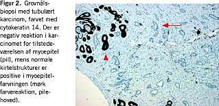 En meget anvendelig gruppe af antistoffer er rettet mod de myoepiteliale celler, som ligger yderst mod basalmembranen i normale gangstrukturer. Påvisning af myoepiteliale celler udelukker invasiv cancer. Antistofferne kan derfor anvendes til at skelne mellem karcinom in situ og invasivt karcinom eller mellem et radialt ar og en tubulær cancer (Figur 2 ). Det er dog vigtigt at erindre, at manglende påvisning af myoepiteliale celler skal fortolkes med stor varsomhed og under hensyntagen til morfologien. Det er derfor også en god ide at anvende to eller flere antistoffer i hvert tilfælde. De mest anvendte antistoffer er rettet mod cytokeratin 14 eller smooth muscle myosin heavy chain (SM-MHC), men også p63- og smooth muscle actin -antistoffer anvendes.
