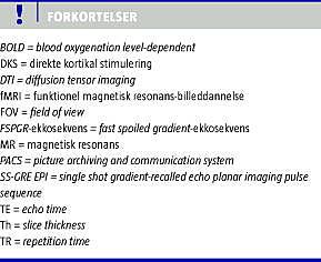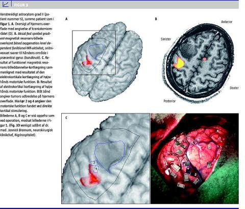 Funktionel magnetisk resonans-billeddannelse (fMRI) kan noninvasivt kortlægge vigtige funktioner i hjernebarken [1-4], og dette kan bruges i den præoperative evaluering af patienter med hjernetumorer. Teknikken bruges i stadig større grad klinisk og kan også bruges intraoperativt i neuronavigationssystemet ved tumorresektion [5].