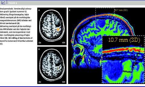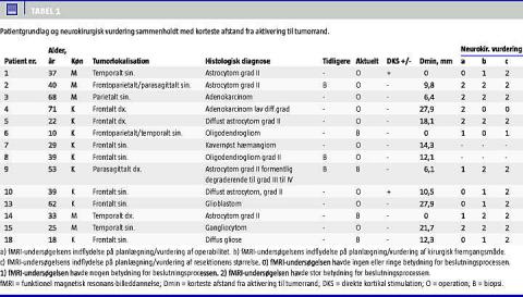 Materiale og metoder: Undersøgelsen er en retrospektiv undersøgelse af 25 patienter. Inklusionskriterierne var operation eller biopsi efter fMRI, og endvidere skulle patienterne have gennemført postoperativ kontrol efter tre måneder. I alt 14 patienter opfyldte disse krav (seks mænd og otte kvinder, gennemsnitsalderen var 39 år). fMRI-rådata blev indhentet vha. en tretesla magnetisk resonans-skanner (Signa HDx R14M5, GE Healthcare). Afstanden fra tumor til fMRI-aktivitet blev målt vha. GE-reformat version 4.2, efter at rådata var blevet forarbejdet i GE BrainwavePA version 1.3.08130. Neurokirurgernes vurdering af fMRI i den præoperative beslutningsproces blev indhentet via et spørgeskema.