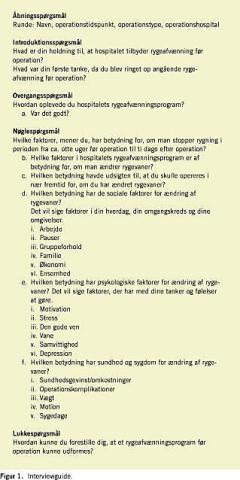 Vi udførte i alt fire fokusgruppeinterview med patienter, der havde deltaget i studiet om rygeinterventionseffekt på komplikationer efter hofte- og knæalloplastik [7]. De interviewede patienter havde alle modtaget interventionstilbud inden deres operation. Interventionstilbuddet bestod af ugentlige samtaler med en rygestopinstruktøruddannet projektsygeplejerske, som rådgav om fordele, ulemper og problemer i forbindelse med ændring af rygevaner. Målet for interventionen var totalt rygestop, alternativt at reducere forbruget med mindst 50% fra 6-8 uger præoperativt til ti dage postoperativt. Ved første møde blev patientens nikotinafhængighedsprofil vurderet ved hjælp af Fagerströms test [8], og der blev målt forceret ekspiratorisk volumen på 1 s (FEV1 ), CO i eksspirationsluften og kotininindhold i en spytprøve. Patienterne blev tilbudt gratis nikotinsubstitution og kunne frit vælge mellem de på markedet tilgængelige produkter.