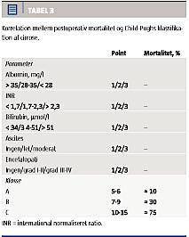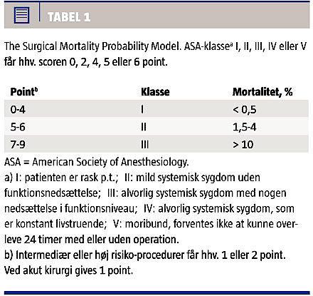 Over 80% af alle dødsfald i den postoperative periode forekommer hos patienter med høj præoperativ risikoprofil. En bedre præoperativ identifikation af disse patienter kan potentielt føre til en bedring i den perioperative behandling. Der findes forskellige værktøjer til prædiktering af mortalitet hos kirurgiske patienter. Det gennemgående træk er, at de inkluderer alder, American Society of Anesthesiologists (ASA)-klasse, komorbiditeter, og hvorvidt det drejer sig om akut eller elektiv kirurgi. Eksempler på denne slags risikoscorer er Surgical Mortality Probability Model, der kan anvendes hos patienter, der skal have foretaget ikkekardial kirurgi [6] (Tabel 1). Andre risikoscorer er udviklet for at forudsige risikoen for morbiditet inden for bestemte organsystemer. Eksempelvis kan man anvende Lee’s Revised Cardiac Risk Index (Tabel 2) [7] til bestemmelse af risikoen for, at der udvikles en alvorlig kardial hændelse i relation til kirurgi, og hos patienter med levercirrose kan der anvendes Child-Pughs klassifikation (Tabel 3) [8]. Der findes talrige lignende risikoscoresystemer, dels sygdomsspecifikke, dels organspecifikke, og mange af disse er validerede i større kirurgiske populationer. En udfordring er dog, at screening med et scoringssystem ikke nødvendigvis resulterer i et bedret behandlingsforløb. Det vil naturligvis også afhænge af sygdomskarakteren, om det vil være relevant at foretage præoperativ screening. Således er det sjældent aktuelt hos den hyperakutte patient, ligesom det også sjældent vil være muligt at lægge langsigtede strategier for optimering af patienter, der skal opereres for cancer.