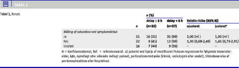 Resultater: Følgende faktorer var associeret til et præoperativt delay = 6 timer: 1) nyindlagt patient, dvs. perforation uden for hospital (justeret relativ risiko (RR) 1,87; 95% konfidensinterval (KI) 0,86-4,05), 2) manglende klassiske kliniske symptomer på akut abdomen (justeret RR ved peritonealreaktion 0,32; 95% KI 0,14-0,73), 3) første lægetilsyn senere end mediantiden, dvs. > 25 minutter efter debut (justeret RR 2,78; 95% KI 1,32-5,87), 4) manglende primært tilsyn af en seniorlæge (justeret RR 1,97; 95% KI 0,95-4,05), og/eller manglende tilkald af bagvagt (justeret RR 2,53; 95% KI 1,12-5,75) og 5) manglende måling af oxygensaturation ved indlæggelse (justeret RR 1,45; 95% KI 0,73-2,91).