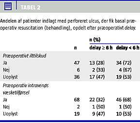 Materiale og metoder: Alle patienter (n = 89), der var opereret for benignt perforeret ulcus på seks universitetshospitaler i Danmark gennem et år, indgik i studiet. Associationen mellem en række prædefinerede variable, der var relateret til organisatoriske forhold, patientens sygdomsbillede og den sundhedsfaglige behandling, og et præoperativt delay på mindst seks timer blev undersøgt ved hjælp af modificeret Poisson-regressionsanalyse.