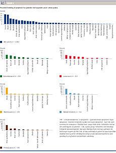 Samtlige symptomer og den procentvise fordeling i studiepopulationen er illustreret øverst i Figur 3 . Det hyppigst rapporterede symptom var smerter (23%). Symptomer som træthed og vægttab sås hos henholdsvis 13% og 12% af alle cancerpatienterne.