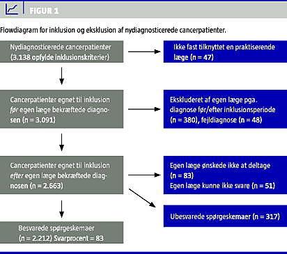 Vi gennemførte en spørgeskemaundersøgelse blandt alment praktiserende læger i det daværende Århus Amt (640.000 indbyggere, omkring 3.000 nydiagnosticerede cancere om året) [1]. Undersøgelsen var et led i en afdækning af ventetider i cancerdiagnostik. Nydiagnosticerede cancerpatienter blev inkluderet på grundlag af indberetninger fra sygehusenes patientadministrative system (PAS). Alle personer på 18 år og derover, der havde fået stillet en cancerdiagnose gennem en etårig periode (fra 1. september 2004 til og med 31. august 2005), blev inkluderet. Patienter med baso- eller spinocellulære hudcancere blev ekskluderet. Figur 1 viser et flowdiagram for inklusion og eksklusion af patienter samt lægernes deltagelse.