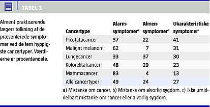 Tabel 1 viser praktiserende lægers tolkning af symptomerne som henholdsvis alarm-, almen- og ukarakteristiske symptomer. Det er iøjnefaldende, at 27% af symptomerne blev tolket som ukarakteristiske og 49% af symptomerne som alarmsymptomer. Ukarakteristiske symptomer var mest udtalte for patienter med prostatacancer, malignt melanom og lungecancer. Alarmsymptomer var mest udtalte ved mammacancer og malignt melanom og mindst udtalt ved lungecancer.