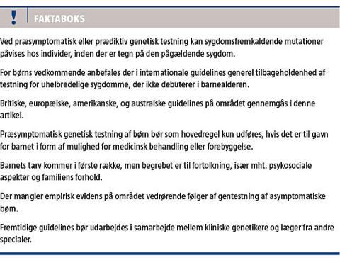 ikke skelnes konsekvent mellem behandlelige og ikkebehandlelige sygdomme. I de britiske og europæiske guidelines er man enige om, at man kan tilbyde at teste, på betingelse af at det vil være i barnets og familiens bedste interesse i psykosocial forstand, men fordele som ulemper må nøje afvejes, ligesom timingen skal være rigtig. I de australske guidelines anbefaler man ekstrem tilbageholdenhed ved sygdomme med mulig debut både i barne- og voksenalder. I de amerikanske guidelines anbefales det, at man giver stor bestemmelsesret til forældre, når det gælder testning for sygdomme, som debuterer i barndommen.