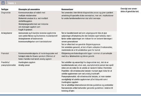 Det skal pointeres, at der findes flere forskellige typer af genetisk test (Tabel 1). En nærmere omtale af diagnostisk testning, anlægsbærertestning og prænatal testning ligger uden for denne artikels fokusområde.