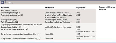Vi ønsker med denne statusartikel at give et overblik over de eksisterende guidelines og policy papers samt lovgivningen vedrørende gentest af børn, med særligt henblik på prædiktiv og præsymptomatisk testning, samt den foreliggende litteratur om psykosociale virkninger heraf. Vi har taget udgangspunkt i guidelines på området fra European Society of Human Genetics [8, 9] og et nyligt publiceret systematisk review [10]. Herfra har vi udvalgt de guidelines fra de største genetiske selskaber i engelsksprogede lande/områder, som er blevet opdateret inden for de seneste fem år, samt relevant litteratur vedrørende de psykosociale virkninger hos børn. Se Tabel 2 for udvalgte guidelines, konventioner og lovgivning.