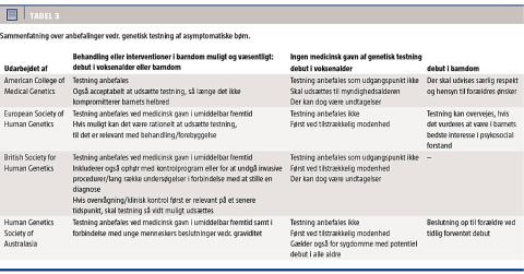 I alle guidelines anbefales, at der tilbydes genetisk testning af børn, når testresultatet vil være til medicinsk gavn i form af behandling eller forebyggelsesstrategier. Der er enighed om, at en mulig reduktion af morbiditet eller mortalitet altid vil være i barnets bedste interesse. I Tabel 3 sammenfattes anbefalinger fra de udvalgte guidelines på de områder, hvor der er uenigheder. Som det fremgår, er der dog forskel på, hvad der medregnes i »medicinsk gavn«.