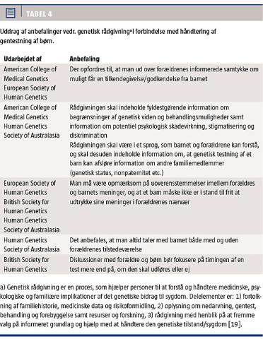 I alle guidelines pointeres det, at grundig genetisk rådgivning er essentiel for, at familien kan træffe en beslutning på oplyst grundlag og give informeret samtykke. I Tabel 4 vises et uddrag af de væsentligste anbefalinger vedrørende genetisk rådgivning.