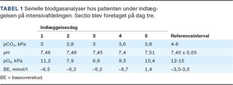 Samme eftermiddag foretog man i spinalanæstesi et ukompliceret sectio med forløsning af et levende barn, der blev overflyttet til et neonatalafsnit. På dag fire blev remdesivir tillagt behandlingen efter leverance fra Danmark. I timerne og dagene efter forløsningen oplevede patienten aftagende dyspnø og bedring i lungefunktionen med faldende iltbehov, hvilket afspejlede sig i niveauet af de arterielle blodgasser (Tabel 1). På dag fem var iltbehovet reduceret til nasalilt 2 l/min, og hun blev overflyttet til et medicinsk afsnit.