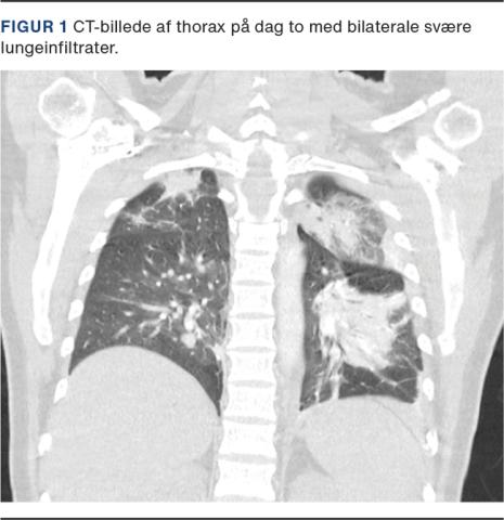 På indlæggelsestidspunktet havde hun en iltsaturation på 99% uden ilttilskud. Hun blev indlagt til observation, og man påbegyndte profylaktisk antikoagulansbehandling med tinzaparin 4.500 IE dagligt. Tilstanden forværredes hurtigt over det næste døgn med tiltagende dyspnø, faldende iltsaturation til 91% uden ilttilskud og blodtryksfald til 60/30 mmHg. Der blev iværksat intravenøs væskebehandling, og hun blev overflyttet til en intensivafdeling. Man udførte en akut CT med kontrast af thorax. Skanningen var uden tegn til lungeemboli, men afslørede svære bilaterale, pneumoniske infiltrater og konsolideret lungevæv (Figur 1). Der blev påbegyndt empirisk intravenøs behandling med cefuroxim mod evt. bakteriel superinfektion.