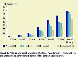Summary Prevalence, treatment and control of arterial hypertension in Denmark - secondary publication Ugeskr Læger 2009;171(3):141-143 The prevalence of arterial hypertension, awareness of the diagnosis, antihypertensive treatment and blood pressure control was measured in a nationally representative population sample comprising both genders and age groups from 20 to 89 years. The age adjusted prevalence was 22,3%. A total of 72% of the hypertensives were aware of their diagnosis, 64% were receiving treatment and 68% of those treated were well-controlled. Diagnosis and treatment was insufficient, but blood pressure control in those treated was better than previously reported and comparable to that found in controlled trials.