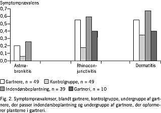 Resultater: Gartnerne havde flere symptomer end kontrolgruppen på astmabronkitis (OR 4,6 [0,98-21,2]), rhinoconjunctivitis (OR 6,4 [2,1-20,2]) og hudgener (OR 4,3 [1,5-12,5]). Overhyppig- heder var især markant blandt gartnere, der passede indendørs-beplantning, og i mindre grad blandt gartnere, der opformerede Fb og Hh. Symptomerne blandt gartnerne var i forhold til kontrolgruppen i mindre grad årstidsafhængige (OR 3,1 [1,1-9]), hyppigere forekommende på arbejdet (OR 16,1 [3,3-78,9]) og ved indendørs ophold (OR 24 [4,8-118,7]).