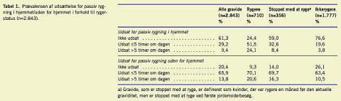 Resultater: I denne population af gravide (n=2.843) var 39% udsat for passiv rygning i hjemmet og 80% uden for hjemmet (66% ≤ 5 timer og 14% > 5 timer om dagen). Gravide rygere var mere udsat for passiv rygning end gravide ikkerygere og gravide, der var stoppet med at ryge tidligt i graviditeten. Gravide ikkerygere, som havde højt body mass index (BMI), højt koffeinforbrug, alder < 25 år, havde født tidligere og havde en rygende partner var oftere udsat for passiv rygning i hjemmet. Gravide ikkerygere, som var i arbejde, havde højt BMI, alder < 25 år, var førstegangsfødende, havde højt koffeinforbrug og havde en rygende partner var oftere udsat for passiv rygning uden for hjemmet.