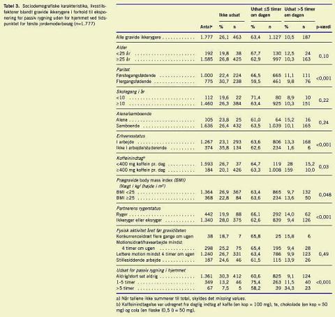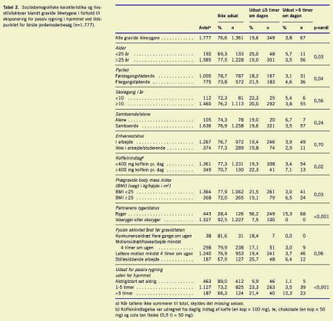 Blandt de 1.777 ikkerygere var følgende kategorier af gravide oftest udsat for passiv rygning i hjemmet: gravide < 25 år (χ2 : p=0,03), flergangsfødende (χ2 : p=0,04), gravide med et koffeinforbrug ≥ 400 mg pr. dag (χ2 : p=0,02), gravide med et body mass index (BMI) ≥ 25 (χ2 : p=0,03) og gravide med en rygende partner (χ2 : p< 0,001) (Tabel 2 ).