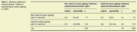 Seks (1,9%) ud af 266 spytprøver havde en spytkotininkoncentration på over 14,2 ng pr. ml, hvilket indikerede, at spytprøverne kunne stamme fra gravide, som røg. I Tabel 4 ses kotininkoncentrationen blandt ikkerygere i forhold til eksponering for passiv rygning. Koncentrationen af kotinin var signifikant højere hos gravide, som var udsat for passiv rygning i hjemmet (Mann-Whitney-test; p=0,03), og hos gravide, som var udsat for passiv rygning både i hjemmet og uden for hjemmet (Mann-Whitney-test; p=0,001), end hos de gravide, som ikke var udsat for passiv rygning overhovedet. Udsættelsen for passiv rygning uden for hjemmet alene gav ikke en klart højere kotininkoncentration (Mann-Whitney-test; p=0,06).
