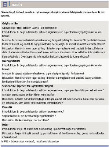 Peer review eller fagfællebedømmelse er en integreret del af den videnskabelige publikationsproces. Selvom effekten af peer review er mangelfuld [1-3], anvendes metoden af de fleste biomedicinske tidsskrifter. Peer review er en hjælp for redaktøren, idet denne sjældent har detailviden på alle områder af det tidsskrift, som artiklen indsendes til, og derved er peer review af stor praktisk værdi i den redaktionelle proces.