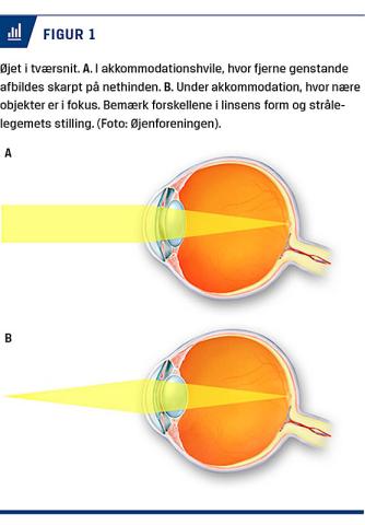 Tabet af akkommodationsevnen med alderen tilskrives et fald i linsens elasticitet og en vedholdende vækst af linsen, hvis epitelceller deler sig hele livet igennem [1]. Resultatet er, at linsen stivner i sin flade form, så det emmetrope øje kun ser skarpt på afstand. Sukkerstoffer i vævsvæskerne bidrager til at gøre linsen stiv ved spontant at danne krydsbindinger mellem linsens proteiner, som ikke udskiftes [3, 4], og linsen bliver tydeligt gulfarvet med alderen [3]. Det er derfor ikke overraskende, at presbyopi udvikles tidligere hos patienter med diabetes end hos andre, da de har et forhøjet indhold af sukker i de ekstracellulære væsker og i visse væv [4]. Ingen behandlingsmetode kan blødgøre eller formindske den aldrende linse.