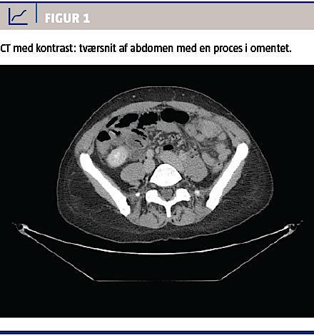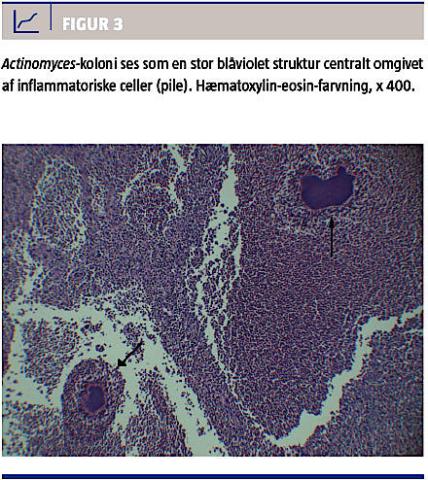 Ved en gynækologisk undersøgelse fandt man normale forhold med en spiral in situ. De vitale parametre var upåfaldende. En biokemisk undersøgelse viste normalt hæmoglobinniveau, basisk fosfatase og negativ S-humant choriongonadotropinniveau, men forhøjet C-reaktivt proteinniveau til 16 mg/l og alaninaminotransferaseniveau på 77 E/l. En CT af abdomen med i.v.-kontrast viste en atypisk inflammatorisk proces i venstre side af abdomen (Figur 1 og Figur 2), og der blev udført diagnostisk laparoskopi på mistanke om inflammeret Meckels divertikel. Ved laparoskopien fandt man i omentum majus en solid tumor, som var adhærent til forreste bugvæg. Efter at man havde sikret sig, at der i øvrigt var normale forhold intraabdominalt, blev tumoren laparoskopisk fjernet en bloc. Makroskopisk vurderet var tumoren 45 × 40 × 20 mm. På snitfladen var den fast heterogen med fedtvævslignende områder og nekroselignende forandringer centralt. Ved mikroskopi af omentet påvistes Actinomyces med karakteristiske sulphur granules bestående af bakterier og inflammatoriske celler (Figur 3). Dyrkning af ascitesvæske og podning fra IUD og cervix viste ingen vækst af Actinomyces. Efter konstatering af Actinomyces fik patienten fjernet spiralen og blev sat i i.v.-behandling med penicillin 5 mio. IE × 4 dagligt i 13 dage, efterfulgt af otte dages behandling med clindamycin 900 mg. Derefter blev patienten behandlet med amoxicillin 750 mg × 3 dagligt.