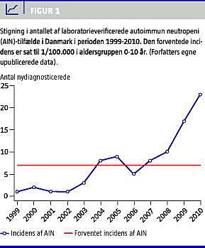 Alvorlige invasive infektioner er relativt sjældne, om end patienterne i perioder kan have neutrofiltal under detektionsniveau, men risikoen for alvorlige infektioner øges ved neutrofiltal < 0,5 mia./l. Tilstedeværelsen af frie granulocytreagerende autoantistoffer i patienternes serum er patognomonisk for AIN med en specificitet > 99% [3]. Opmærksomheden på autoimmun neutropeni synes i de seneste år at være blevet betydelig skærpet, hvilket har medført, at vi i Danmark har bemærket en markant stigning i diagnosticerede tilfælde, således at incidensen af laboratorieverificeret AIN nu er 3,3/100.000 i aldersgruppen < 10 år (Figur 1 ).