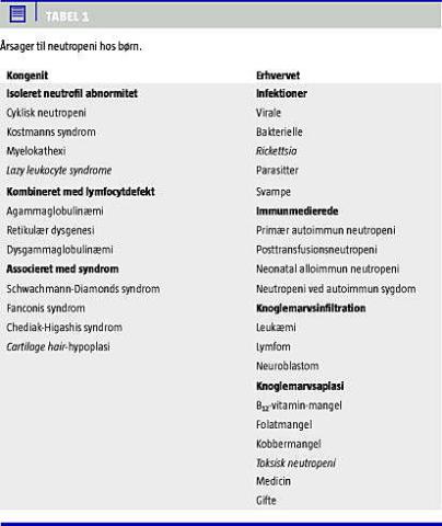 Neonatal alloimmun neutropeni er den vigtigste differentialdiagnose hos børn < 6 mdr. og kan medføre neutropeni op til 9 mdr. post partum. Hos større børn og voksne skal sekundære årsager til autoimmun neutropeni, herunder medicinudløst neutropeni, anden autoimmun sygdom eller maligne tilstande altid udelukkes. Patienter med AIN kan have varierende neutrofiltal under sygdomsforløbet, og neutrofiltallet kan nærme sig normalområdet i forbindelse med svære infektioner. Der observeres imidlertid ikke et regelmæssigt mønster, som er karakteristisk for de cykliske neutropenier [12, 13]. For årsager til neutropeni hos børn se Tabel 1 .