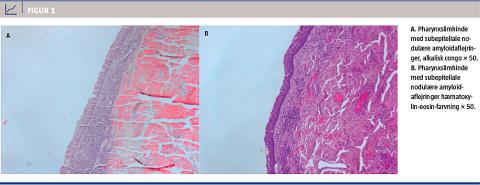 Histologisk fandt man subepiteliel infiltration med lymfocytter og polyklonale plasmaceller. Tumoren var opbygget af nodulært arrangeret acellulært eosinofilt amorft materiale, som var positivt for amyloidspecialfarvninger (Figur 1A og B), og diagnosen LA blev stillet.