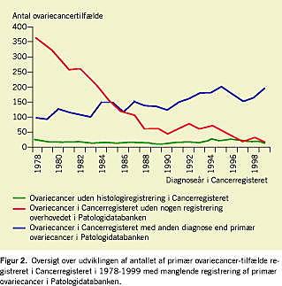 Introduktion: I Cancerregisteret (CR) har man indsamlet information om kræfttilfælde siden 1943. Patologidatabanken (PDB) er en nyere, landsdækkende databank, hvori man samler information om alle undersøgelser foretaget på patologiafdelinger. Med udgangspunkt i diagnosen primær ovariecancer (OC) sammenlignede vi registreringen i de to registre i 1978-1999.