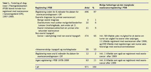 Vi fokuserede på perioden 1997-1999 i redegørelsen for de manglende OC-registreringer i PDB, da kun få kvinder var uden registrering overhovedet i PDB, hvilket tyder på, at man på stort set alle patologiafdelinger var i stand til at overføre data til PDB fra 1997 og frem. Af det totale antal kvinder (n = 1.701) registreret med histologisk verificeret OC i CR i denne periode var 571 (34%) ikke registreret med primær OC i PDB før 1999 (data ej vist). Af disse var 87% registreret i PDB med en anden diagnose end primær OC inden for seks måneder fra diagnosedatoen i CR (Tabel 1 ). I alt 67 kvinder var registreret med en anden ovariel diagnose end OC, heraf 32 med borderline- tumorer, mens størstedelen (n = 374) var registreret med cancer med nonovariel topografi. Af disse var 16% (n = 58) registreret med en cancer lokaliseret til ovarier og salpinges uden mulighed for at fastslå den eksakte oprindelse, mens 80% (n = 299) havde registreringer, som var fuldt forenelige med ovariecancermetastaser, dog var 62 tilfælde registreret som primære og ikke sekundære, adenokarcinomer i peritoneum, oment eller i bløddelsvæv i pelvis/abdomen (data ej vist). Ikkeanvendelige topografi/morfologikoder var registreret hos 55 kvinder inden for seks måneder fra OC-registreringen i CR, mens kun 12 havde registreringer mere end seks måneder efter. De 63 kvinder (11%), som ikke var registreret i PDB i studieperioden, kom primært fra to amter, som efter tilkobling til PDB i 1999 kun overførte en patients ældre data i forbindelse med registrering af nye prøver. I alt 18 kvinder var registreret med OC efter 1999. Således var 495 kvinder (571 minus 18 med OC efter 1999 og minus 58 med tuba/OC) ud af 1.701 (29%) uden primær ovariecancerregistrering i PDB.