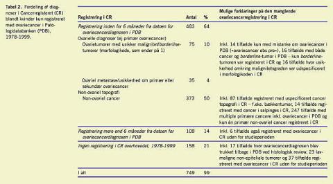 Blandt de 749 kvinder, som kun var registreret med primær OC i PDB i 1978-1999, var 483 (64%) registreret i CR med en anden diagnose end primær OC inden for seks måneder fra første registreringsdato i PDB (Tabel 2 ). Oftest var det registreringer af nonovarielle cancere (n = 373) som f.eks. anden gynækologisk cancer (45%), tarmcancer (14%), anden abdominal primær cancer (10%) eller cancer med uspecificeret topografi (23%) (data ej vist). Ved gennemgang af registreringerne i PDB omkring tidspunktet for OC-diagnosen fandt vi, at 247 kvinder foruden OC-diagnosen også samtidigt var registreret med andre primærcancerdiagnoser i PDB. Kun for 158 kvinder var der overhovedet ingen registreringer i CR i 1978-1999. Dette antal var jævnt fordelt gennem hele studieperioden (data ej vist). For 37 af disse kvinder var der dog en OC-registrering i CR uden for studieperioden, og 23 tilfælde var lavmaligne nonepiteliale tumorer uden anmeldelsespligt til CR. Desuden var 17 tilfælde diagnosticeret på en frysemikroskopi, hvor efterfølgende histologisk undersøgelse afkræftede OC-diagnosen.