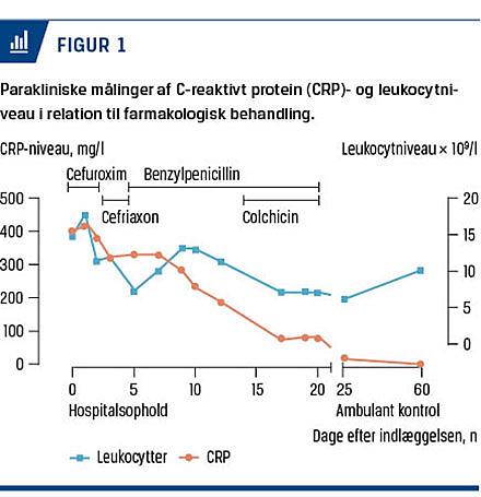 En 50-årig mand med mangeårig diabetes mellitus type 2 og let posttraumatisk artrose i højre knæ blev indlagt efter to døgn med feber, almen sygdomsfølelse og tiltagende smerter, hævelse af højre knæled samt ømhed af højre håndled og venstre fodled. Ved ankomsten var han afebril og kun lettere påvirket. Blodtrykket var 127/73 mmHg. Han scorede 15 på en Glasgow coma-skala, og der var ingen meningealia eller udslæt. Højre knæled var hævet med let varmeforøgelse, men ingen rødme. Højre håndled og venstre fodled var hyperæmiske uden hævelse. Paraklinisk var niveauet af C-reaktivt protein (CRP) 394 mg/l, P-leukocytniveauet 14,5 × 109/l og trombocytniveauet 91 × 109/l. International normaliseret ratio var 1,2. P-blodsukkerniveauet var 35 mmol/l, og laktatniveauet var normalt. På mistanke om septisk artritis i højre knæ blev der foretaget akut ledpunktur med udtømmelse af 60 ml purulent ledvæske efterfulgt af akut artroskopisk subtotal synovektomi. Empirisk blev han behandlet med intravenøst givet (i.v.) cefuroxim 750 mg × 4 dagl. Da der efter halvandet døgn blev påvist gramnegative diplokokker i bloddyrkning og ledvæske og senere vækst af N. meningitidis, blev der skiftet til i.v. ceftriaxon 2 g × 1 dagl. Efter resistensbestemmelse skiftedes til i.v. benzylpenicillin 3 MIE × 4 dagl. En ekkokardiografi var uden tegn på endokarditis. Grundet betydelig hævelse af højre knæ og trægt faldende fasereaktanter (Figur 1) foretog man på dag fire en ny artroskopisk synovektomi uden at finde betydende synovitis. En MR-skanning af højre knæ var uden tegn på absces eller osteomyelitis. På 12.-dagen suppleredes behandlingen med colchicin. Efterhånden opnåede man klinisk og paraklinisk bedring med normalisering af CRP-niveauet på dag 26. Patienten blev behandlet i to uger med i.v. ceftriaxon/benzylpenicillin og derefter i fire uger med peroral penicillin. Ved ambulant kontrol efter seks uger var der god klinisk fremgang. Patientens husstandsmedlemmer fik profylaktisk ciprofloxacin.