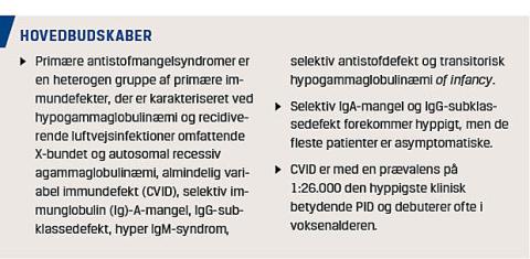 PAS er en heterogen gruppe og udgør 50-60% af de primære immundefekter. De fleste patienter har recidiverende sinopulmonale infektioner. Screening for PAS kan foregå i almen praksis ved måling af IgG-, IgM-, IgA- og IgG-subklasser. Ved mistanke om PAS skal der henvises til pædiatere eller infektionsmedicinere til videre udredning og behandling [25].