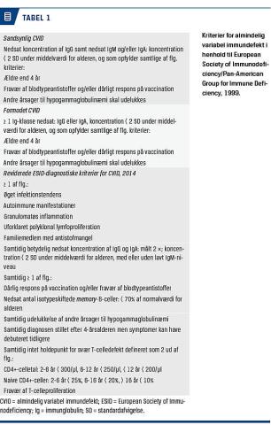 I 1999 publicerede European Society of Immunodeficiency (ESID) og the Pan-American Group for Immune Deficiency de første diagnostiske kriterier for CVID (Tabel 1) [10]. De oprindelige ESID-kriterier inkluderede ikke kliniske kriterier, og derfor er der i 2014 udarbejdet reviderede kriterier (Tabel 1). Ifølge de reviderede kriterier udskilles patienter med tegn på betydende T-celledefekt fra CVID-gruppen og klassificeres som havende en kombineret T- og B-celledefekt [11].