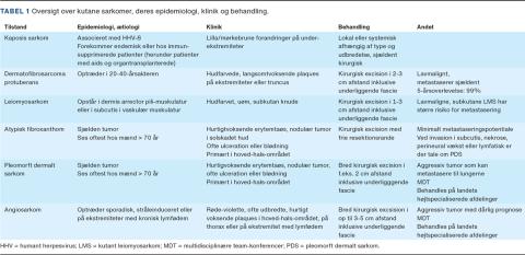 Kutane sarkomer er en heterogen gruppe af sjældne tumorer, som primært rammer ældre patienter. Diagnosen kan være vanskelig at stille klinisk og stilles altid ved biopsi, som bør vurderes ved patologer med særlig ekspertise. Standardbehandlingen for hudsarkomerne, på nær KS, er kirurgisk excision, som ofte er sufficient, såfremt der opnås histologisk verificerede negative marginaler.